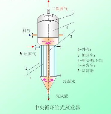 中央循環(huán)蒸發(fā)室是加熱室上部的圓筒體。料液經(jīng)過加熱管加熱,水分汽化,料液比重變小,而中央降液管中料液沒被加熱至沸騰(料液比重較大)。由于傳熱產(chǎn)生重度差,形成物料在加熱管和降液管中的循環(huán),將水分蒸發(fā),達到濃縮的目的。而加熱蒸汽釋放出潛熱后,變成水,從底部排出管排出。