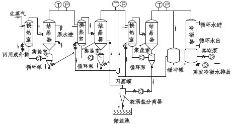 需要蒸發(fā)的物料經(jīng)進(jìn)料泵進(jìn)入一效加熱器進(jìn)行加熱,然后進(jìn)入蒸發(fā)室,進(jìn)行蒸發(fā),在分離器中進(jìn)行氣液分離,溶液從分離器底部流入循環(huán)泵吸入口,利用循環(huán)泵送入加熱器、分離器進(jìn)行循環(huán)流動與蒸發(fā),蒸發(fā)出來的蒸汽進(jìn)入冷凝器被全部冷凝。在蒸發(fā)換熱室內(nèi),外接蒸汽液化產(chǎn)生汽化潛熱,對廢水進(jìn)行加熱。由于蒸發(fā)換熱室內(nèi)壓力較大,物料在蒸發(fā)換熱室中高于正常液體沸點壓力下加熱至過熱。加熱后的液體進(jìn)入結(jié)晶蒸發(fā)室后,物料的壓力迅速下降,導(dǎo)致部分物料水溶液閃蒸或者沸騰。廢水蒸發(fā)后的蒸汽進(jìn)入二效蒸發(fā)器作為動力蒸發(fā)器進(jìn)行加熱,未蒸發(fā)廢水和鹽分暫存在結(jié)晶蒸發(fā)室。一效、二效、三效蒸發(fā)器之間通過平衡管相通,在負(fù)壓所用下,高含鹽廢水或物料由一效向二效、三效依次流動,廢水不斷被蒸發(fā),廢水中鹽的濃度越來越高,當(dāng)廢水物料中的鹽分超過飽和狀態(tài)時,水中鹽分就會不斷地析出,進(jìn)入蒸發(fā)結(jié)晶室的下部的集鹽室,整個過程周而復(fù)始,實現(xiàn)鹽水分離。